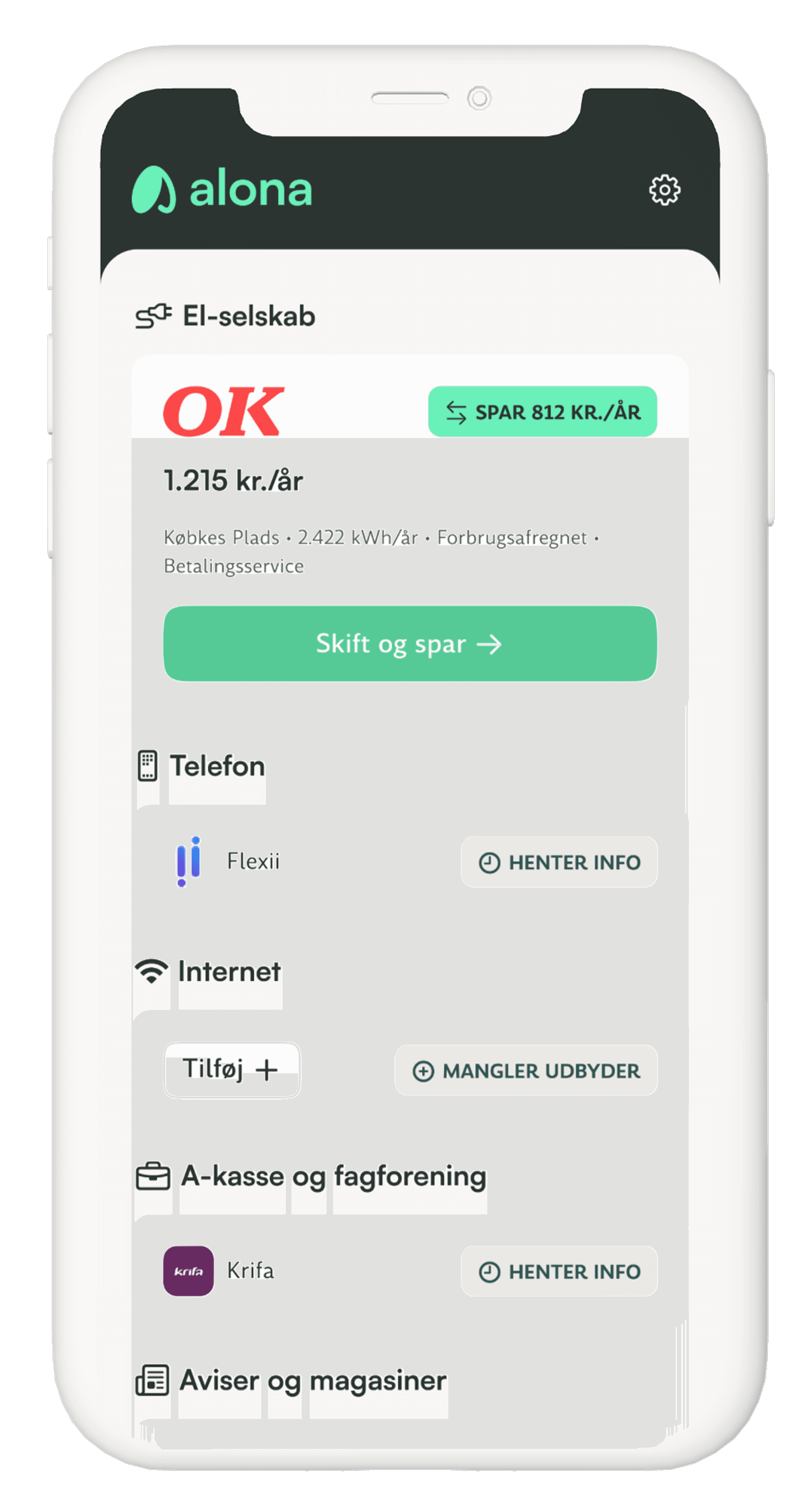 Baseret på dine aftaler, finder Alona bedre tilbud på markedet — eller genforhandler det, du har i dag. Altid transparent, altid på dine præmisser. Alt du skal gøre er at takke ja eller nej til lavere regninger.